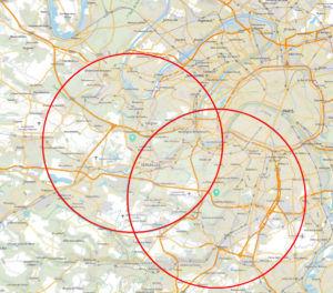 Cela fait déjà un bon périmètre de visites malgré le fait que ce périmètre se réduise car nous le faisons en famille et chacun son périmètre. Donc la zone est à la conjonction des deux cercles.