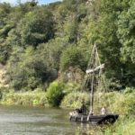 On poursuit sur la V42 vers le moulin de Boël puis au détour d’un lacet, nous tombons sur une gabare et une installation d’une fête avec jeux médiévaux prévue pour le soir. Même en plein préparatif, ils acceptent de nous faire un café.